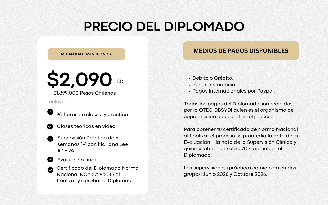 Para recibir tu Certificado del DIPLOMADO, debes cumplir con los siguientes requisitos: Asistir o ver las clases ( 90% al menos), pasar la evaluación que se promedia con la nota de la supervisión clínica, ese promedio debe ser igual o superior al 70% para aprobar el Diplomado. El Diplomado tiene Certificación de Calidad de la Norma Nacional NCh 2728:2015